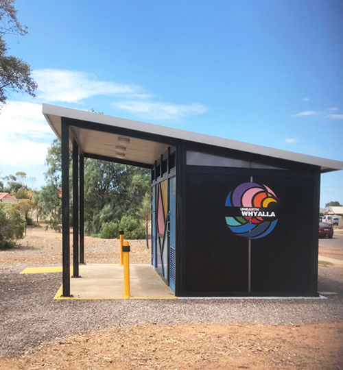 The skillion shelter is manufactured from structural gradealuminium with a insulated roof and stainless-steelanti-vandal fixings.