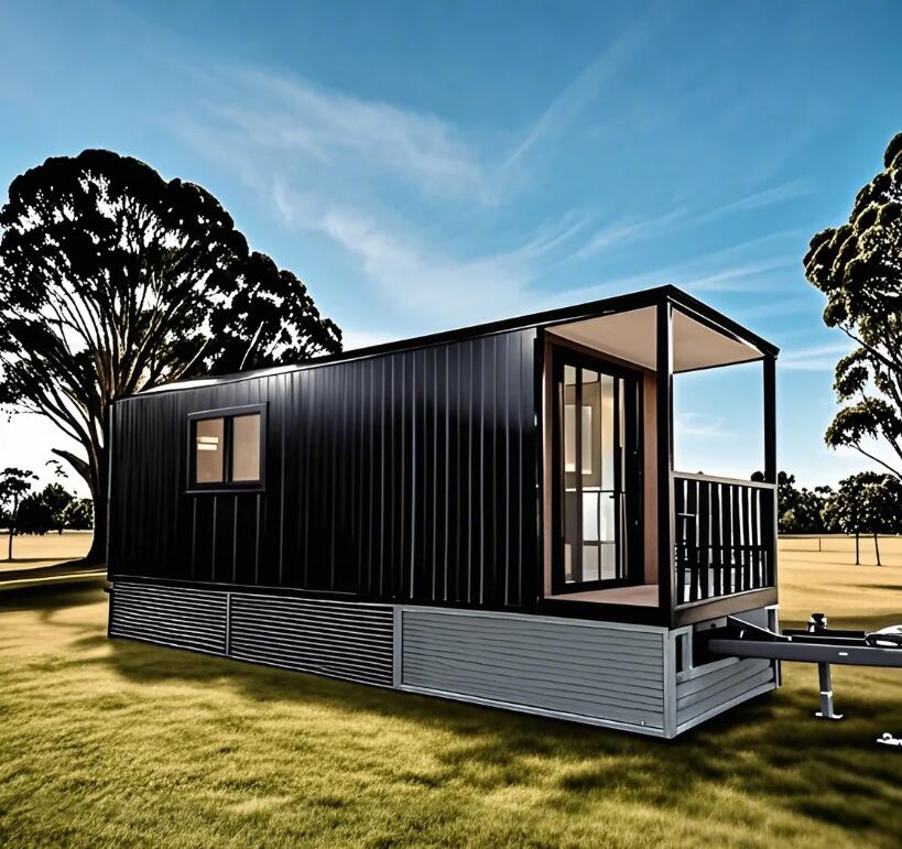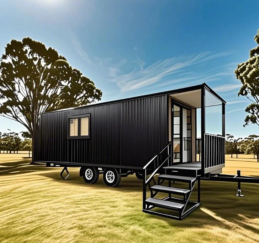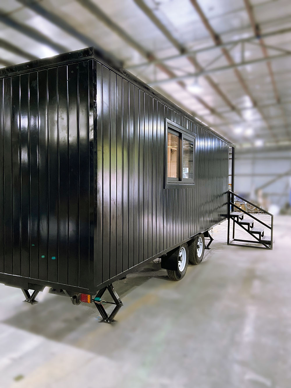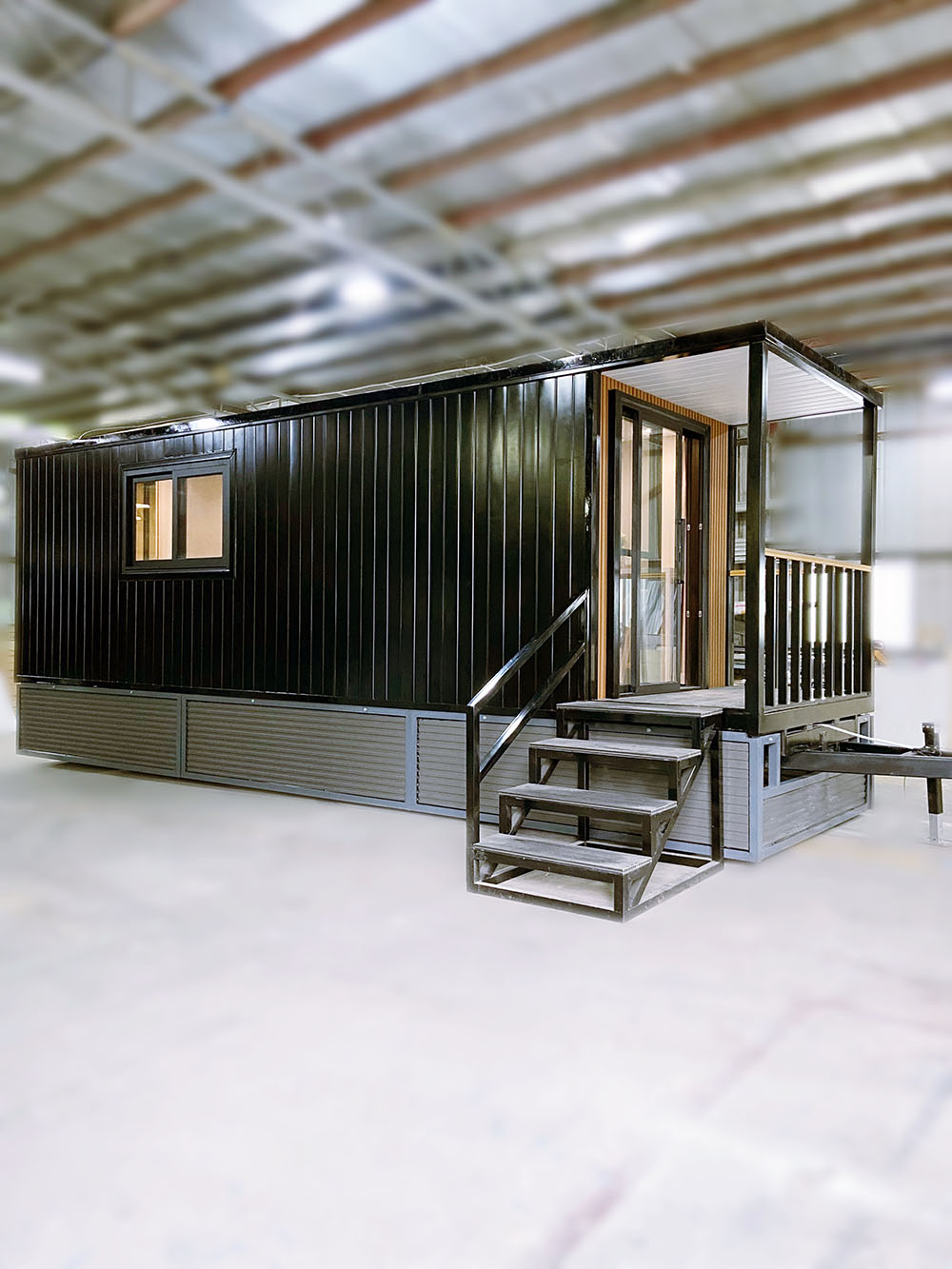 Model S is an ingeniously designed mobile tiny house that stands out for an exceptionally unique veranda. Its compact yet highly functional interior features a sleek kitchen, a modern bathroom, and a comfortable bedroom. All are within an exterior shell presenting sustainable and modern design.